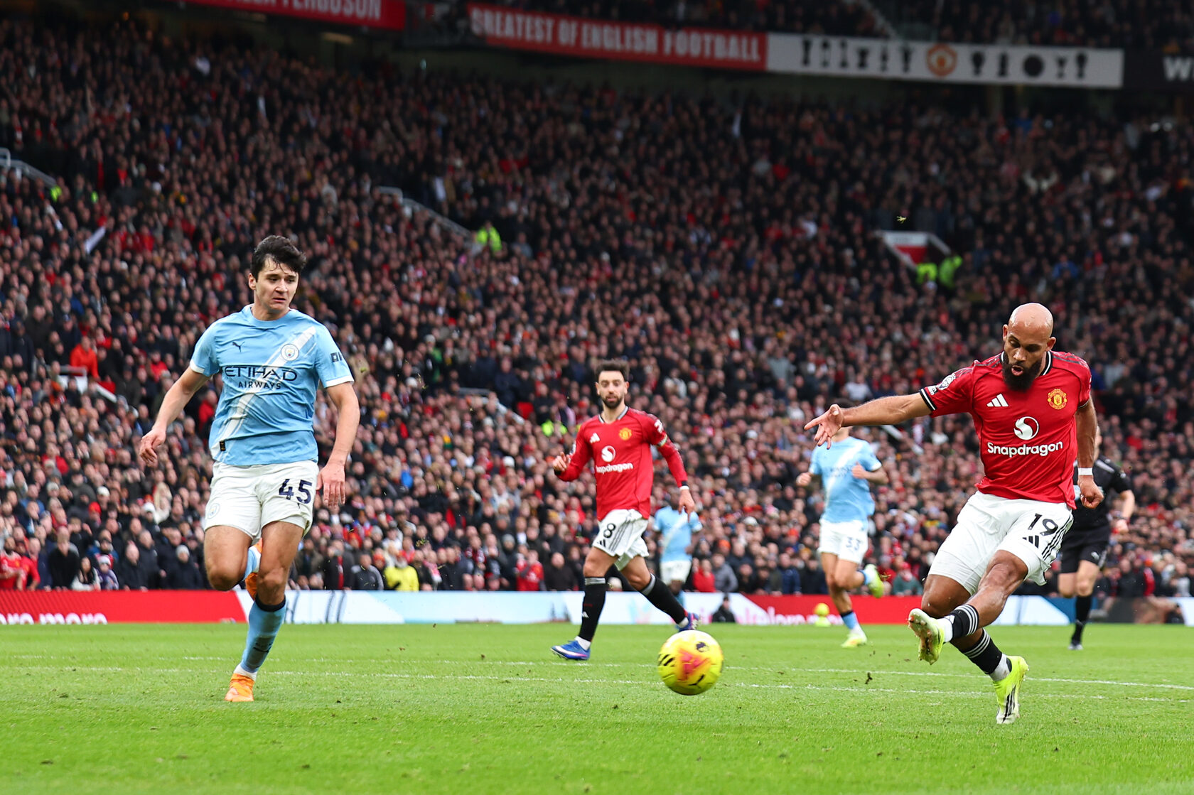 «Манчестер Юнайтед» действовал агрессивно и вдохновенно. Однако реализация и судейские решения держали болельщиков в напряжении. Дважды мяч оказывался в сетке ворот «горожан», и оба раза празднование прерывалось флажком арбитра. Сначала Амад чуть поторопился с рывком, а затем Бруну Фернандеш, филигранно обыгравший Доннарумму, оказался вне игры лишь на «ширину носка». На другом конце поля Сенне Ламменс подтвердил свой класс, нейтрализовав опаснейший удар Макса Аллейна.